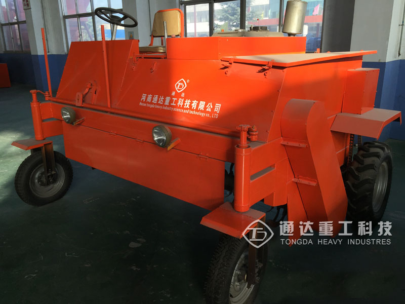 该机采取四轮行走设计,可前进、倒退、转弯,由一人操控驾驶。行驶中整车骑跨在予先堆置的长条形肥基上,由机架下挂装的旋转刀轴对肥基原料实施翻拌、蓬松、移堆,车过之后形成新的条形垛堆。该机即可在开阔室外露天场地,也可在车间大棚中实施作业。